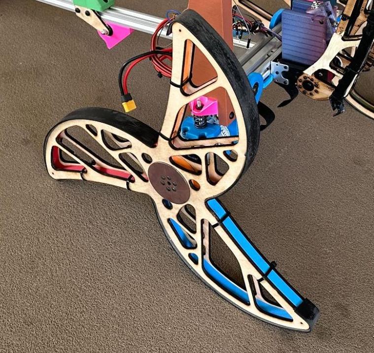 Our tri-spoke wheel design proved exceptionally effective at climbing the stairs. However, the long spokes were susceptible to bending loads if the robot tipped over. To ensure robustness, I designed the wheels as a sandwich composite with birch plywood skins and a PETG core. We tested the bending strength of several core infill densities and adhesives, finding that a 15% infill core bonded with cyanoacrylate created the strongest construction. I also used topology optimization in Fusion 360 to reduce unnecessary mass from the plywood skins.